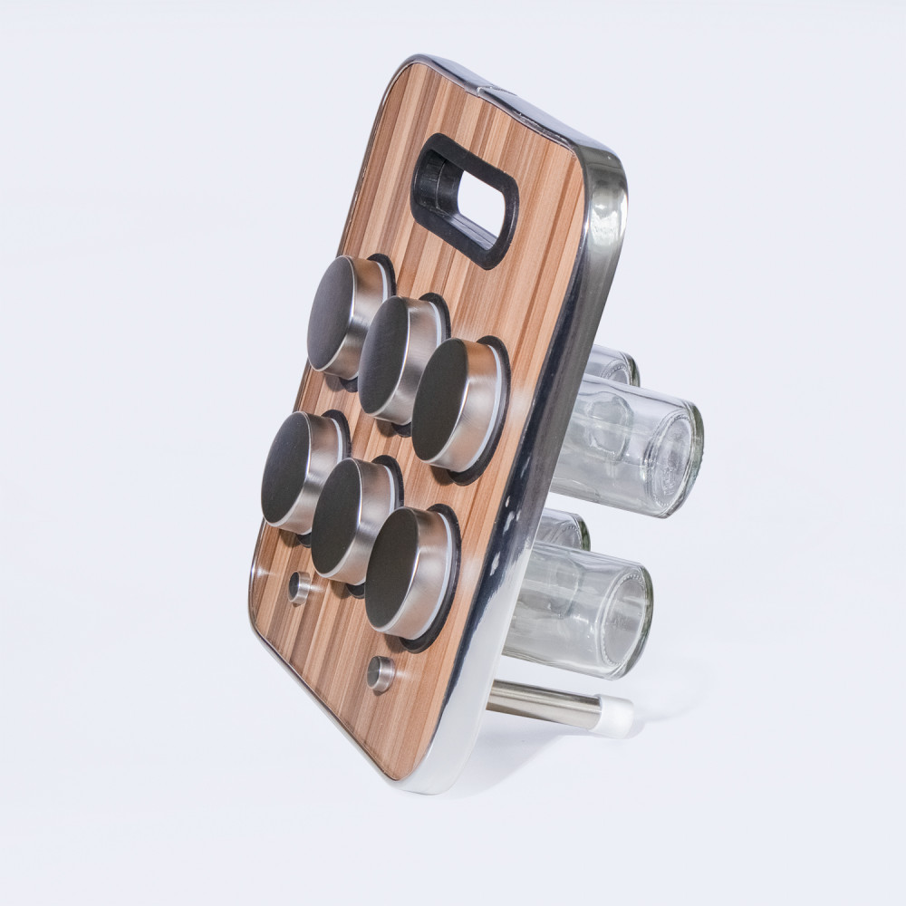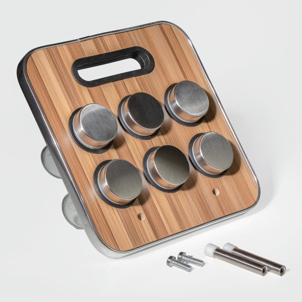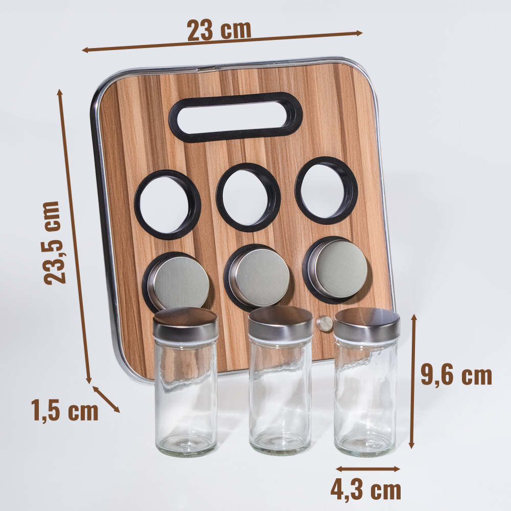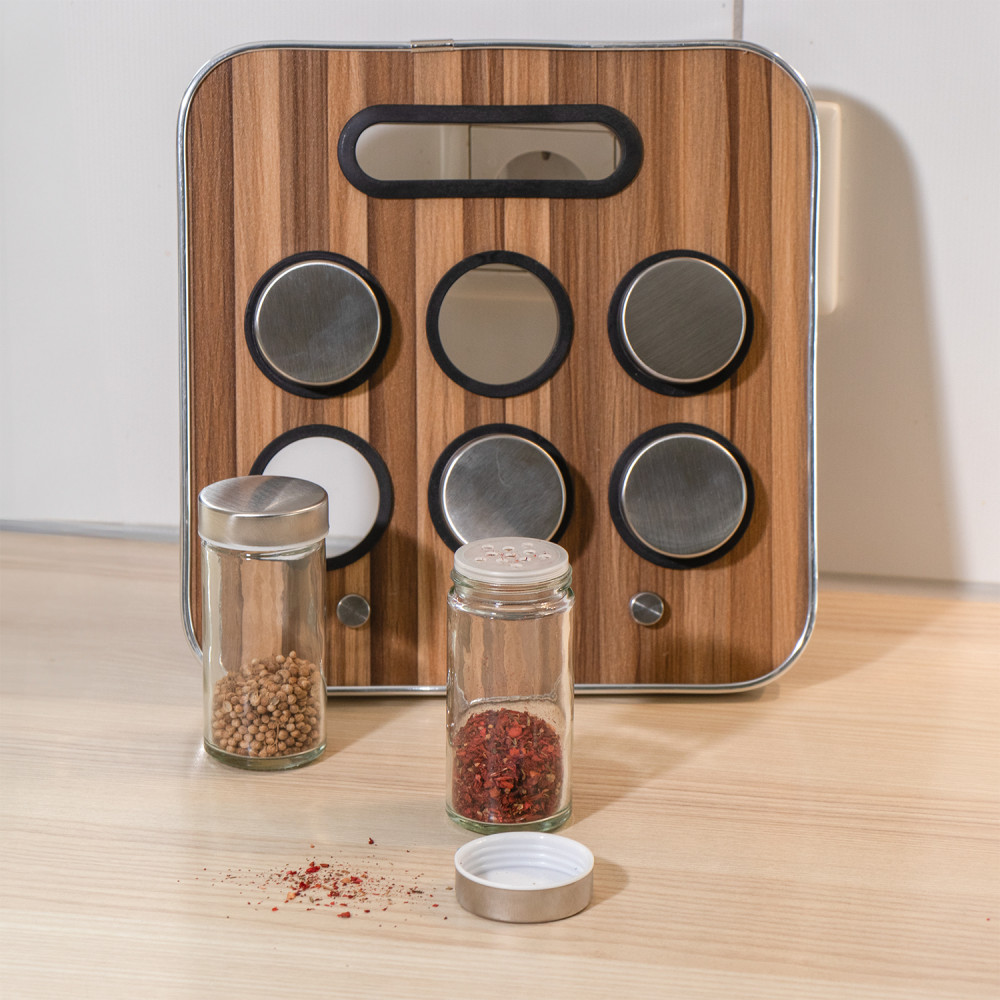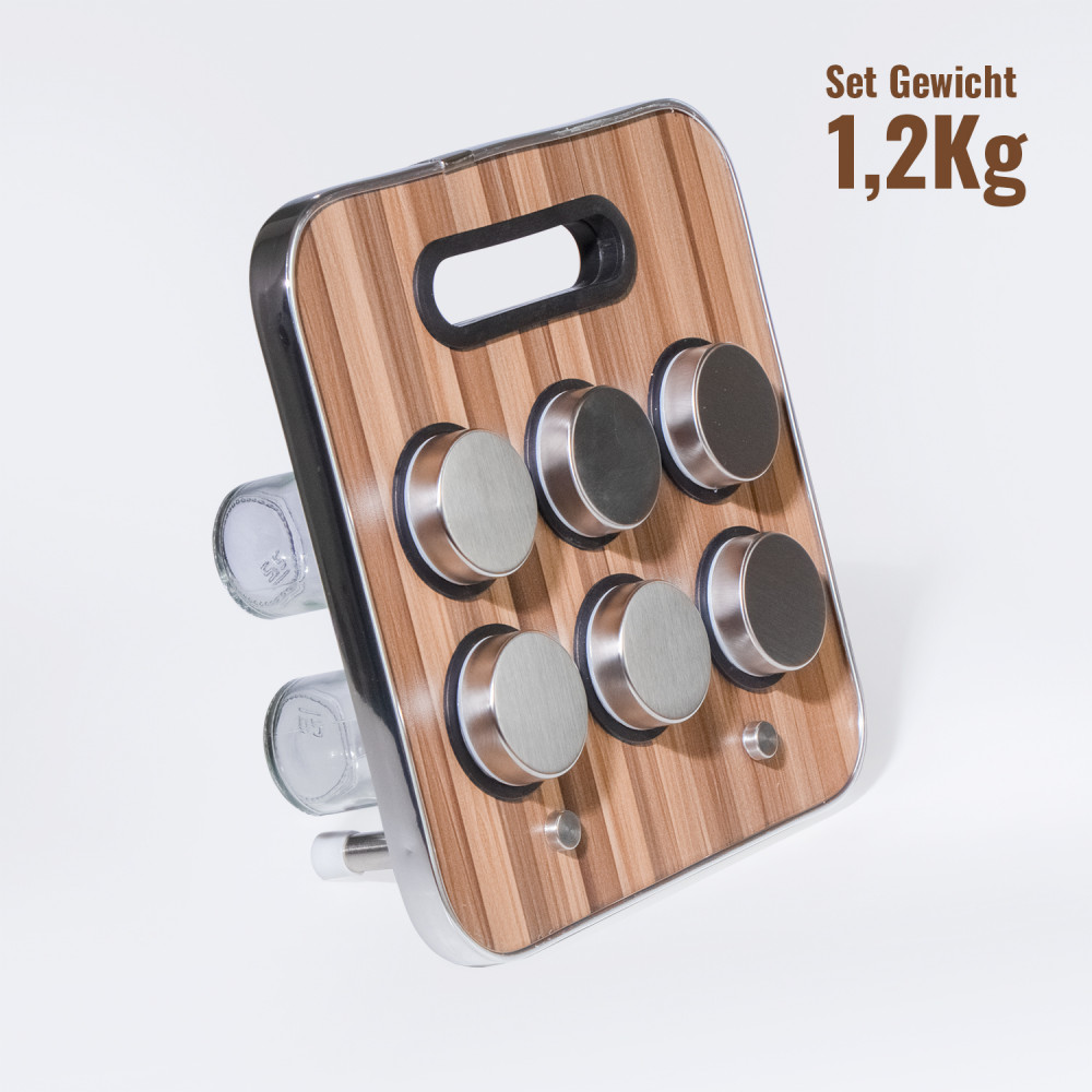 Gewürzständer mit 6 Gewürzdosen, Gewürzhalter aus Edelstahl und Kunststoff im edlen Holzdesign.23x23,5x1,5 cm. Spice Holder. 6x Gewürzdosen sind aus Glas und Edelstahl gefertigt und sind im Set enthalten.