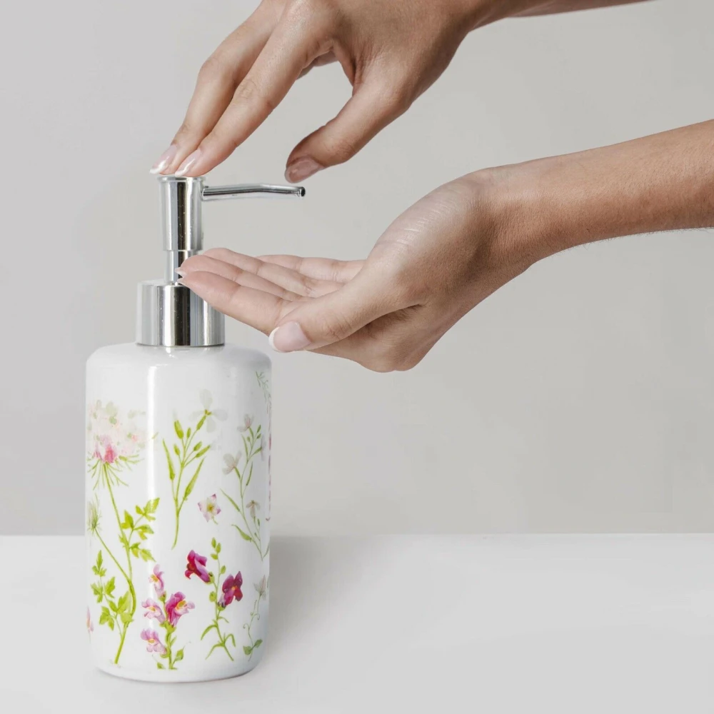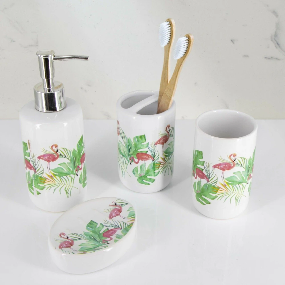 Kreieren Sie ein tropisches Thema in Ihrem Badezimmer, indem Sie es mit Accessoires aus der Flamingo-Serie oder einer zarten Accessoires-Kollektion mit Blumenmotiv ergänzen, um ein gemütliches und einladendes Interieur mit außergewöhnlichen Details zu schaffen.