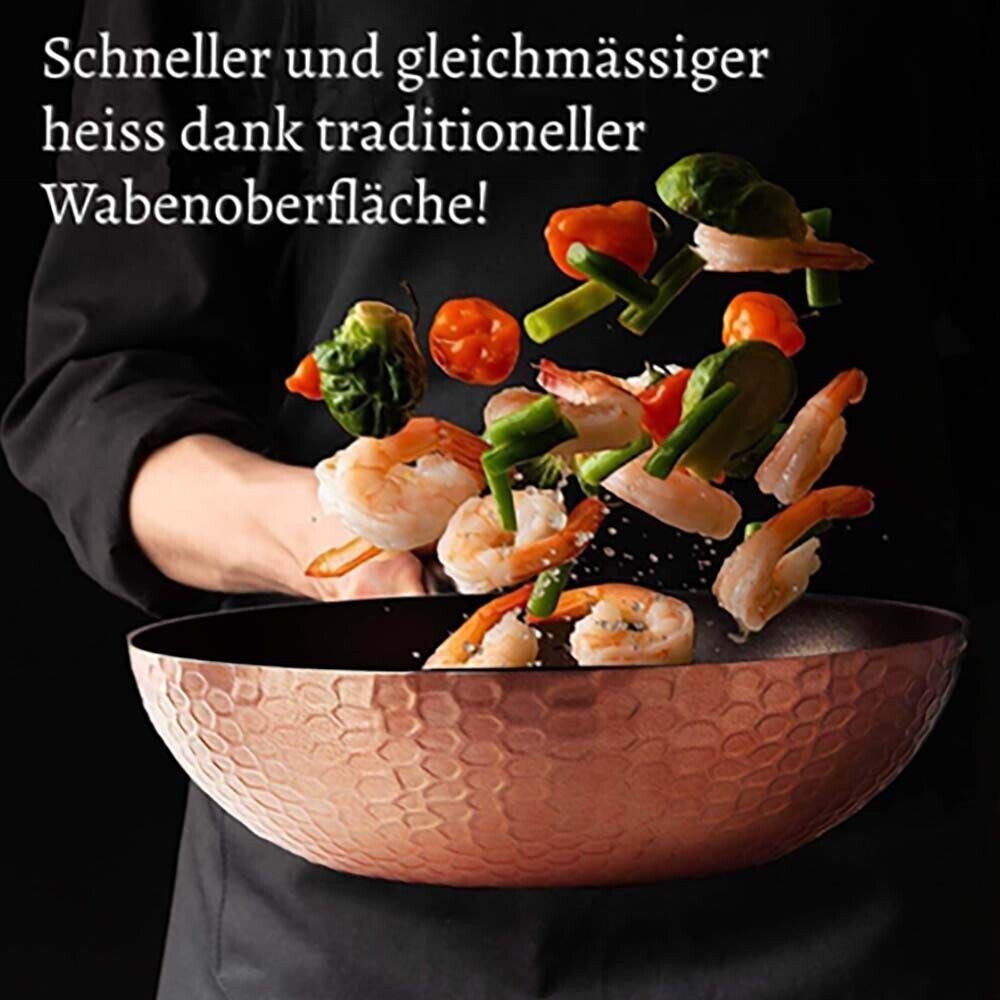 Profipfanne. Perfekt für asiatische Gerichte. Für alle Herdarten geeignet. Leicht abnehmbarer Griff. Leichte Reinigung ohne Rückstände. Viele Verwendungsmöglichkeiten.