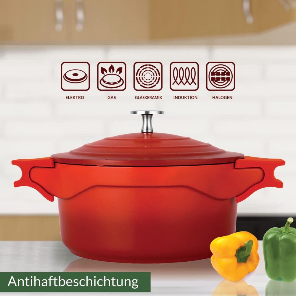 Dieser Topf mit Antihaftbeschichtung und einem dicken Boden von 6 mm eignet sich perfekt zum Kochen, Braten oder Schmoren verschiedener Gerichte. Die Antihaftbeschichtung ermöglicht eine fettarme Zubereitung und fördert somit eine gesunde Ernährung. Der Topf hat eine Wandstärke von 3 mm, um eine schonende und gleichmäßige Zubereitung sicherzustellen. Die abnehmbaren gummiartigen Griffe machen den Topf einfach vom Herd zu nehmen und er ist auch für Induktionsherde geeignet. Mit seinem ergonomischen und modernen Design ist dieser Topf ein echtes Vergnügen beim Kochen.